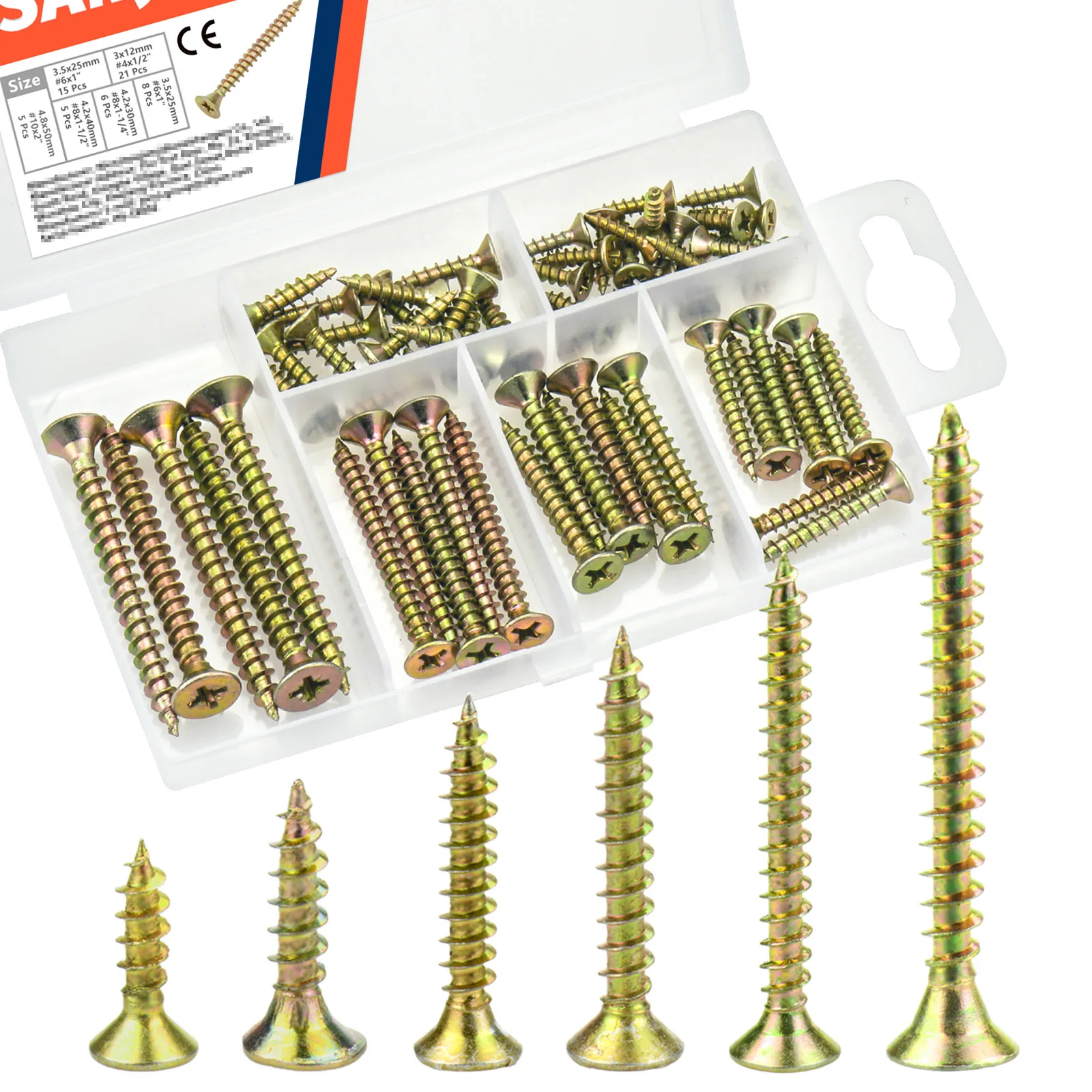 60 total high-hardness wood screws (6 sizes, evenly assorted).